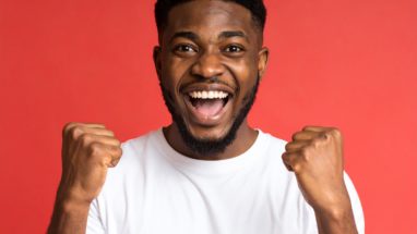 喜び ガッツポーズと笑顔で喜びを爆発させる青年