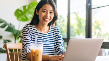 カフェで笑顔の女性とノートパソコン