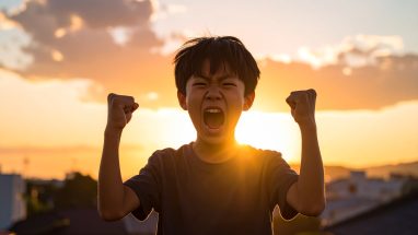 影の中で立ち尽くす少年とぬいぐるみの静寂