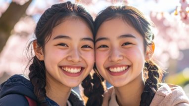 笑顔あふれる春の日 — 桜の下で寄り添うふたり