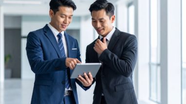 笑顔で資料を手にする日本人ビジネスマン|信頼感と爽やかな印象