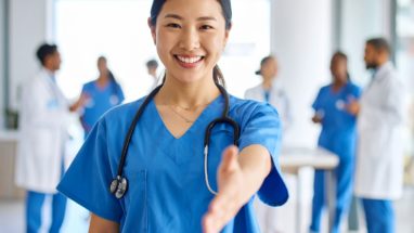 笑顔で迎える看護師の温かな握手
