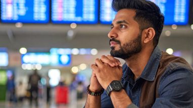 空港で静かに未来を見つめる男の横顔──旅立ち前の沈黙