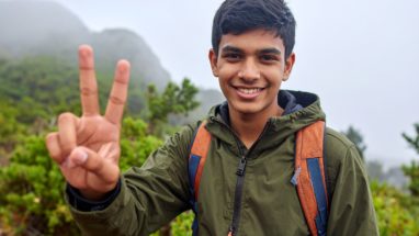 カーテンの隙間から外を見つめる好奇心いっぱいの少年