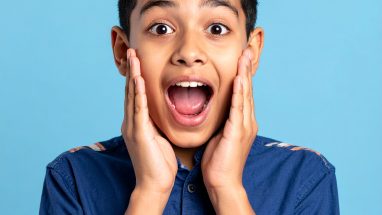 驚きをそのままに。両手で顔を押さえる少年の感情表現