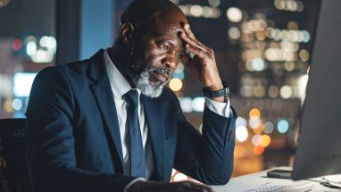 深夜のオフィスで頭を抱える男性の苦悩