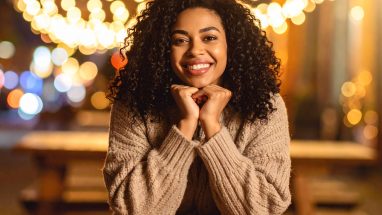 イルミネーションの下で微笑む女性の癒しポートレート