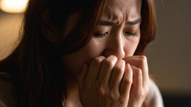 不安 カーテンの影からのぞく少女|不安と緊張を表す感情素材