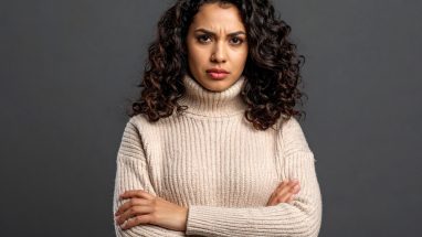 不満 腕を組みながら睨みつける怒りの表情の若い女性