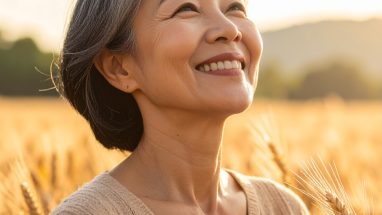 夕暮れの麦畑で微笑む女性のやすらぎ
